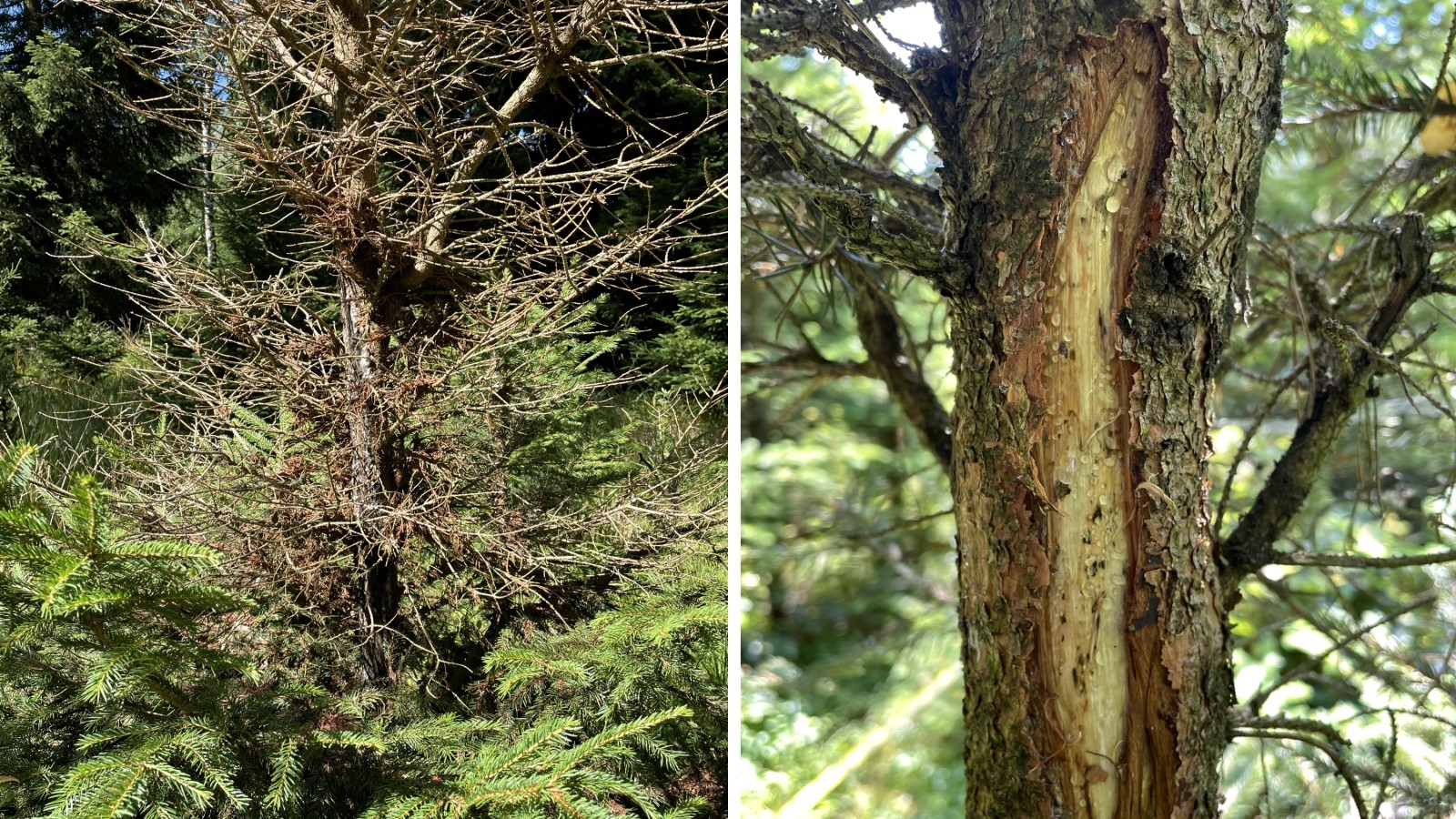 Vlevo – starší poškození mladého jedince smrku ztepilého, které může v případě většího rozsahu zapříčinit odumření terminální části kmene. Vpravo – nově vzniklé poškození stromu loupáním. Foto: Jan Cukor