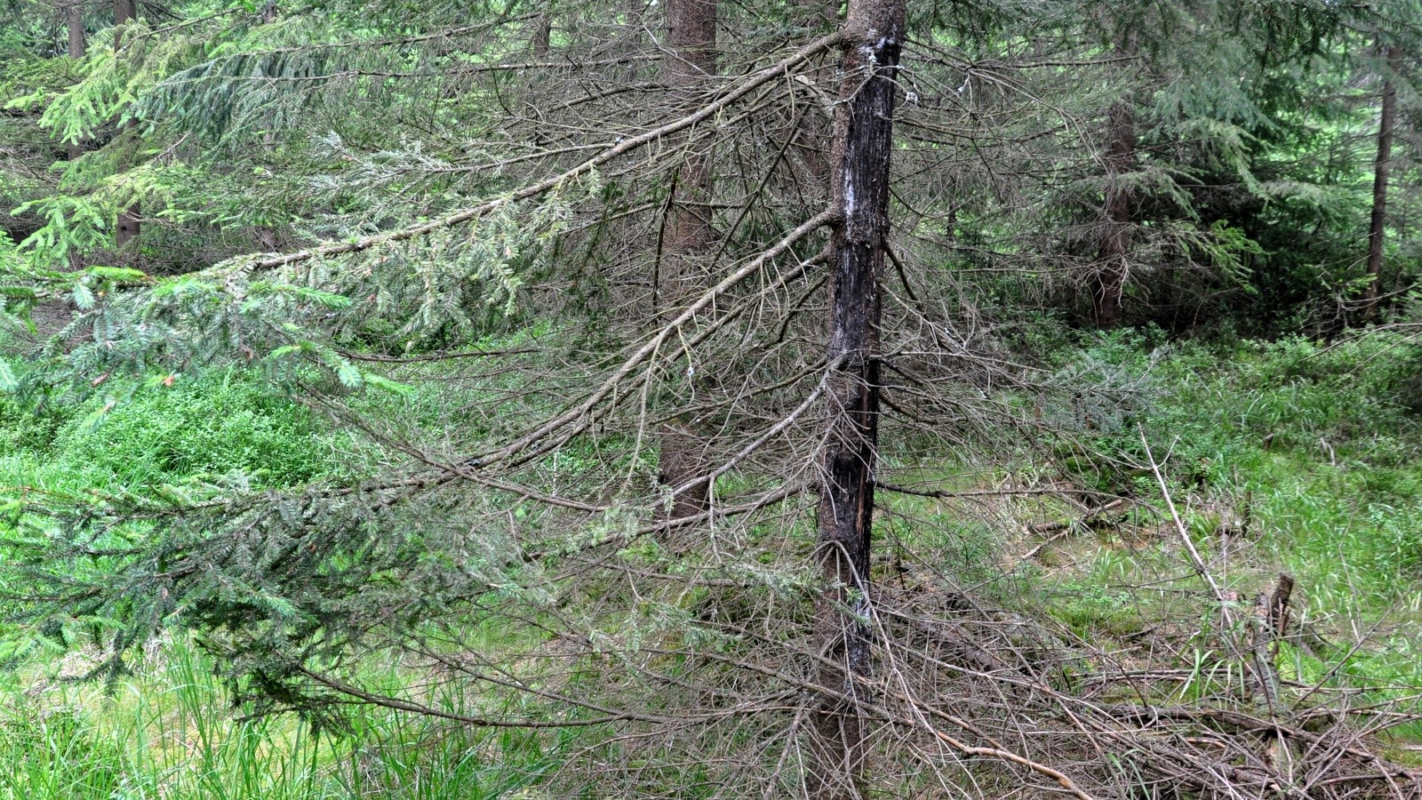 V mládí silně poškozené dnes již dospívající smrkové porosty, bazální části kmenů jsou znehodnocené hnilobou, stromy jsou náchylné ke zlomům, mechanická stabilita porostu je významně snížena. Foto: Jan Řezáč