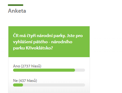 Ministerstvo životního prostředí na svých stránkách spustilo anketu s otázkou: ČR má čtyři národní parky. Jste pro vyhlášení pátého - národního parku Křivoklátsko? Zájemci mohou hlasovat zde (anketa je v levém spodním sloupci)