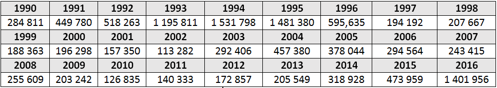Evidované poškození porostů suchem od roku 1990 (m3):