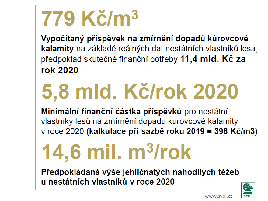 Podle SVOL je zřejmé, že ani tentokrát nestátní vlastníci na celou potřebnou částku nedosáhnou. Jako nezbytné minimum výše příspěvků pro nestátní vlastníky lesů na zmírnění dopadů kůrovcové kalamity za rok 2020 (kalkulace při sazbě roku 2019) SVOL odhaduje sumu 5,8 mld. Kč.