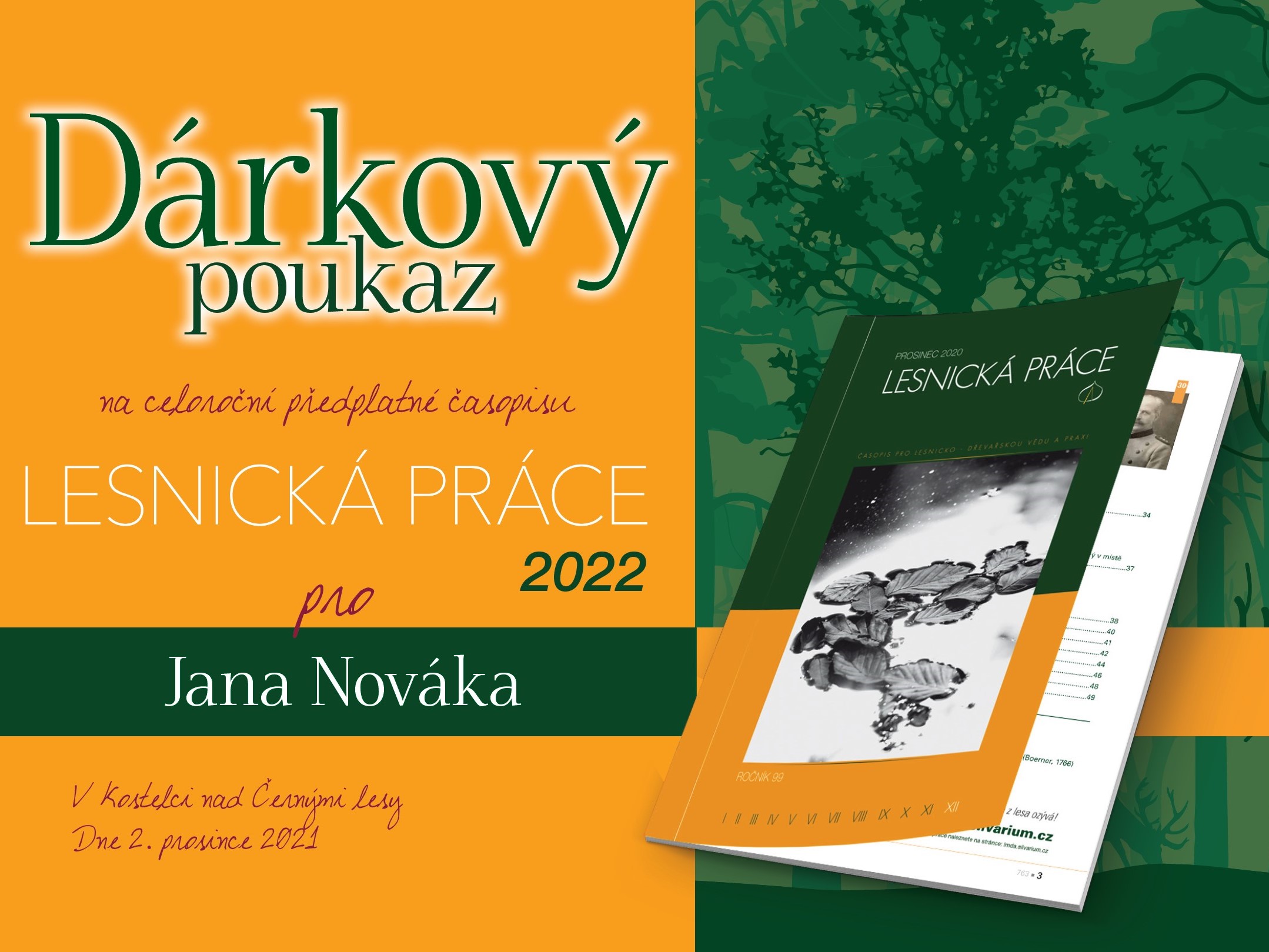 Roční předplatné Lesnické práce nebo Světa myslivosti můžete pořídit i formou dárkového poukazu, který lze objednávat na tel.: 604 211 171 nebo e-mailem: Tato e-mailová adresa je chráněna před spamboty. Pro její zobrazení musíte mít povolen Javascript..