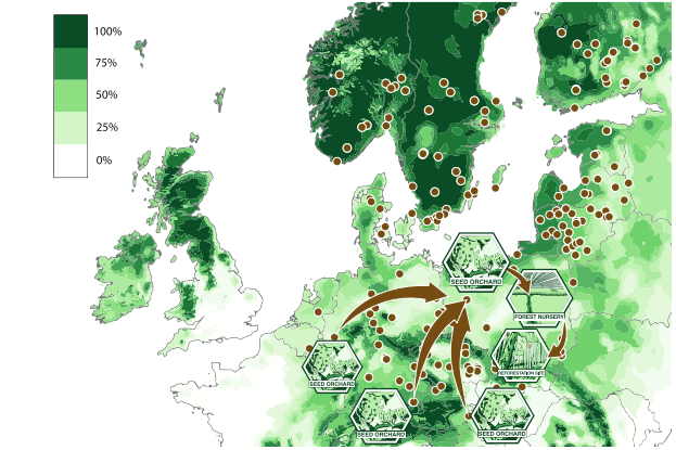 Pravděpodobnost rozšíření smrku ztepilého v Evropě v očekávaných klimatických podmínkách v rozmezí let 2041–2060. Hnědé body jsou pozice jednotlivých semenných sadů v Evropě. Schéma znázorňuje přenos pylu mezi semennými sady s následnou produkcí sazenic pro zalesnění. Zdroj: ČZU