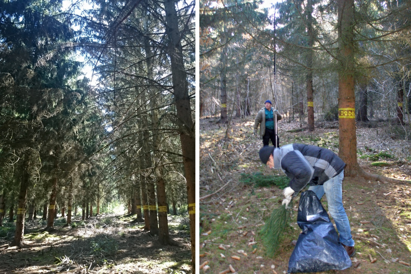 Vlevo – klonový archiv ex situ rezistentního krušnohorského smrku na lokalitě Cukrák u Jíloviště. Foto: Josef Frýdl; vpravo – odběr roubů v klonovém archivu ex situ rezistentního krušnohorského smrku na lokalitě Cukrák u Jíloviště Foto: Pavel Pexídr