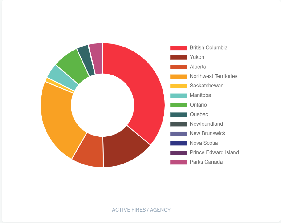 Aktivní požáry v Kanadě dle administrativního členění.