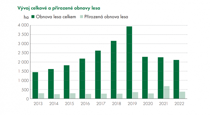 Ačkoliv byl počáteční stav holin k 1. 1. 2022 historicky nejvyšší, došlo v průběhu roku k poklesu konečné plochy holin, a to cca o 662 hektarů. Přírůstek holin byl v důsledku úspěšného boje proti kalamitě naopak třetí historicky nejnižší za posledních 15 let. Nižší přírůstek VLS zaznamenaly v letech 2007 a 2008. Celková obnova lesa v loňském roce klesla o 128 ha. Celková plocha přirozené obnovy poklesla na necelých 400 ha, ale její podíl z první obnovy lesa se stále drží nad 20 %. Podíl opakované obnovy na celkové obnově lesa stoupl na 14 % a nezdar zalesnění na 16 %.