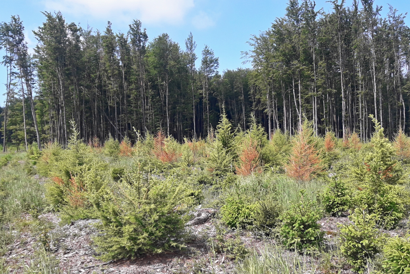 Hojná byla také mramorová sypavka borovice (Cyclaneusma minus), a to často na prosychajících borovicích. V douglaskových mlazinách byly zastoupeny švýcarská a skotská sypavka (Nothophaeocryptopus gaeumannii a Rhabdocline pseudotsugae) a na smrku sypavka smrková (Lophodermium piceae).