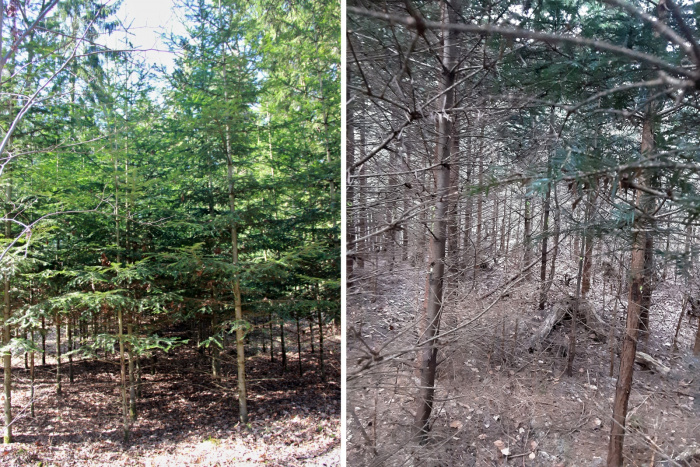 Vlevo: v uměle založených kotlících s jedlí dochází brzy k akceleraci výškového růstu a bez odpovídající výchovy hrozí přeštíhlení a zkracování korun; vpravo: pěstebně zanedbané jedlové mlaziny se vyznačují silným zkrácením korun a přeštíhlením.