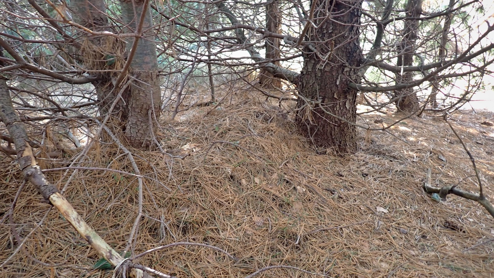 Na snímku z interiéru porostu borovice rumelské na výzkumné ploše Jizerka je zjevný nahromaděný opad jehlic na povrchu půdy a přetrvávající zavětvení kmene. Foto: Dušan Kacálek
