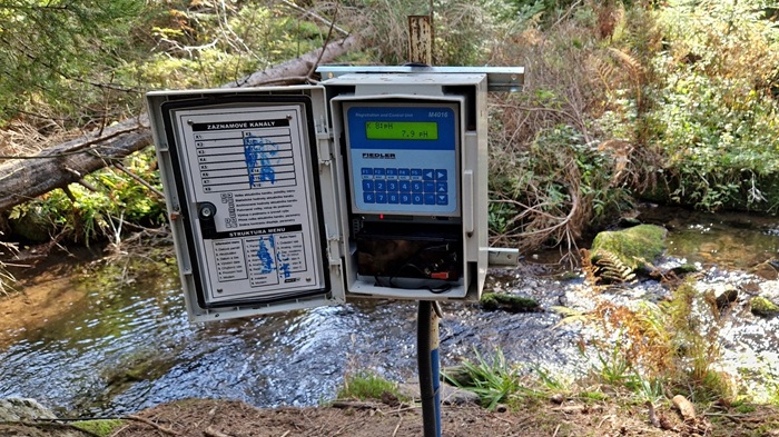 Měřicí stanice u potoka na výzkumné ploše v Jeseníkách.