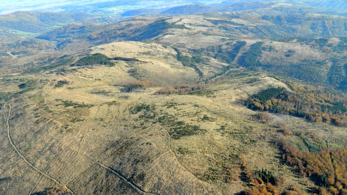 Kalamitní holiny extrémního rozsahu po zpracování nahodilých kůrovcových těžeb (Bruntálsko, říjen 2024).