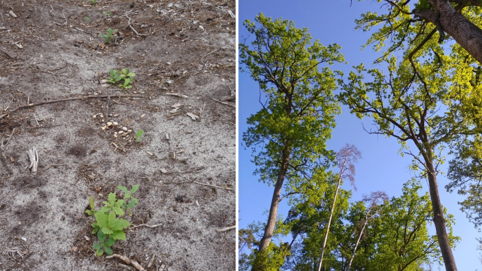 Vlevo – při vnášení dubů do porostů lze uplatnit i obnovu síjí, úspěšná misková síje na plochu připravenou štěpkováním a orbou; vpravo – zvýšené teploty a nepravidelnost srážek posledních let způsobují oslabení dřevin včetně dubů; pokles olistění a náchylnost k poškození biotickými činiteli narůstá s věkem porostů.