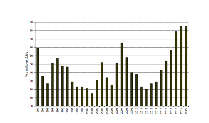 Podíl nahodilých těžeb od roku 1990. Zdroj: Zpravodaji ochrany lesa – Supplementum 2021, VÚLHM
