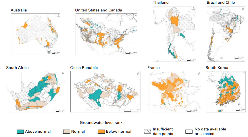 Průměrné hladiny podzemních vod ve vybraných zvodních v roce 2022 v porovnání s historickým obdobím 2013-2022. Pozn.: Modrá - nad normálem, tělová - normál, oranžová - pod normálem, pruhované - nedostatečný počet dat, bílé - žádná dostupná nebo vybraná data. Zdroj: Zpráva Světové meteorologické organizace