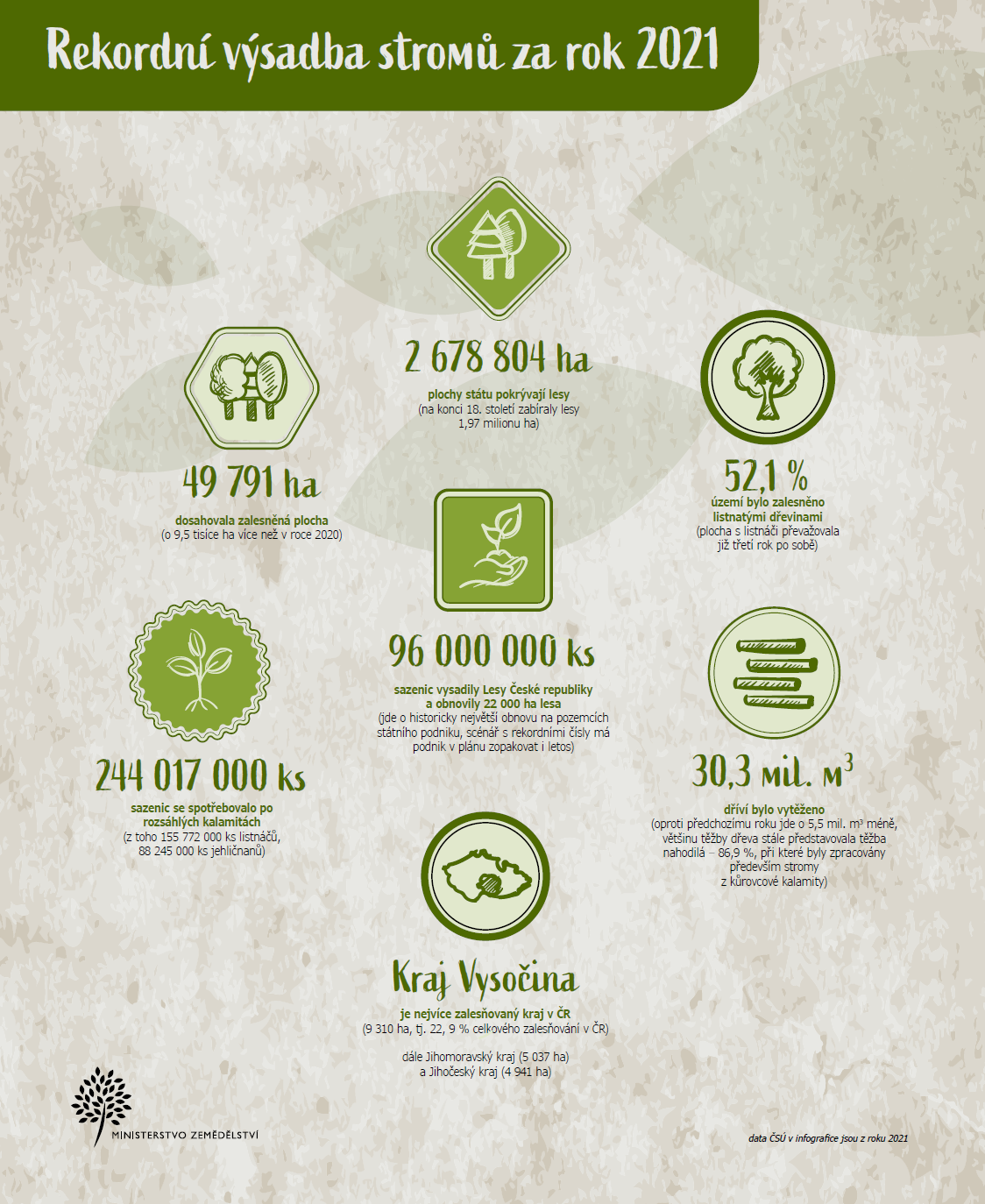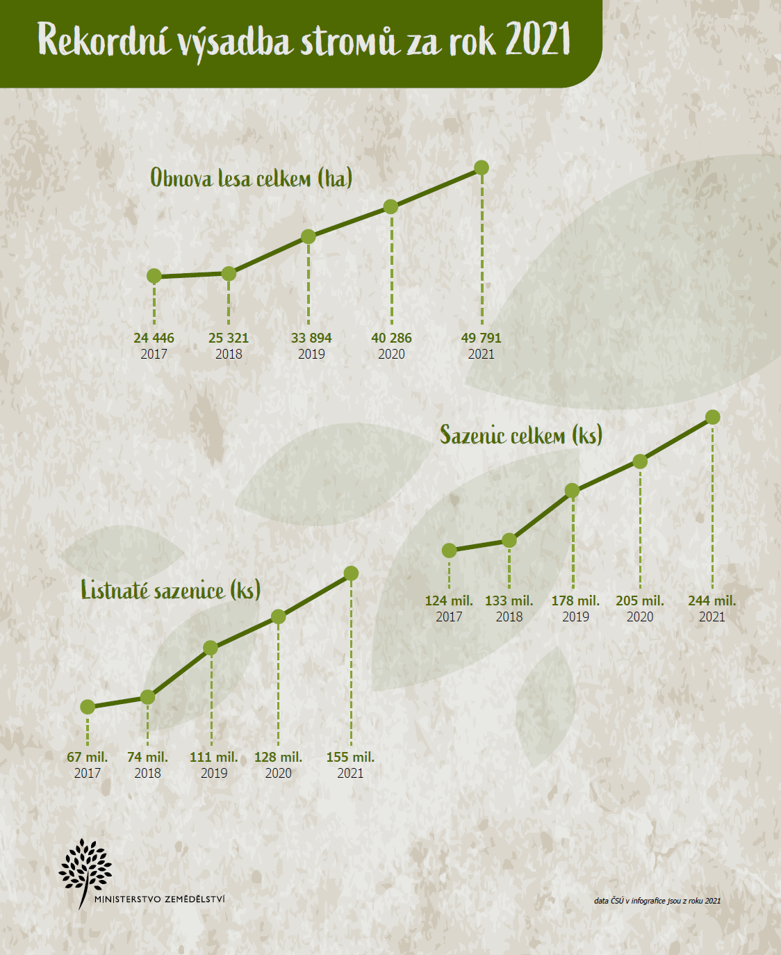 „V posledních letech vysazujeme více listnatých než jehličnatých stromů. Naším cílem jsou druhově pestré lesy. Daří se nám do lesa dostávat původní dřeviny, jako jsou dub, buk nebo javor, které jsou odolnější vůči klimatické změně. Nikdy jsme neobnovovali lesy takovou rychlostí a v takovém rozsahu, jako v loňském roce. Chtěl bych proto lesníkům poděkovat za všechno, co pro naše lesy dělají," řekl ministr zemědělství Zdeněk Nekula.