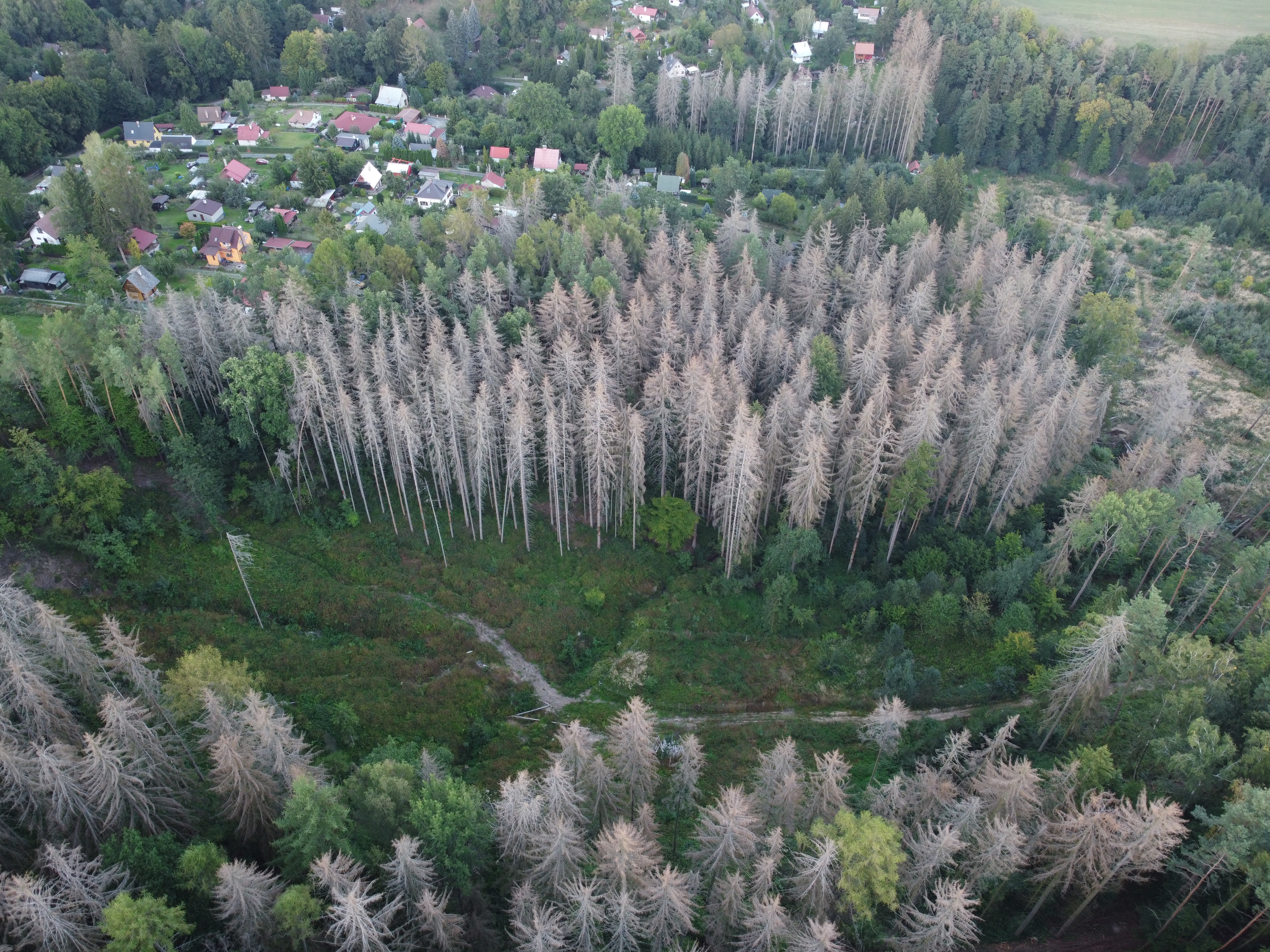 Co se týče klimatické a protierozní funkce nebo retence srážek, tak tyto účinky lesa jsou u stojících suchých porostů velice omezené a blíží se hodnotám holé plochy. Z tohoto důvodu je nezbytná co nejrychlejší obnova lesa (využití stávajícího přirozeného zmlazení, umělá obnova a následná péče o kultury s postupným vznikem zapojeného lesního porostu).