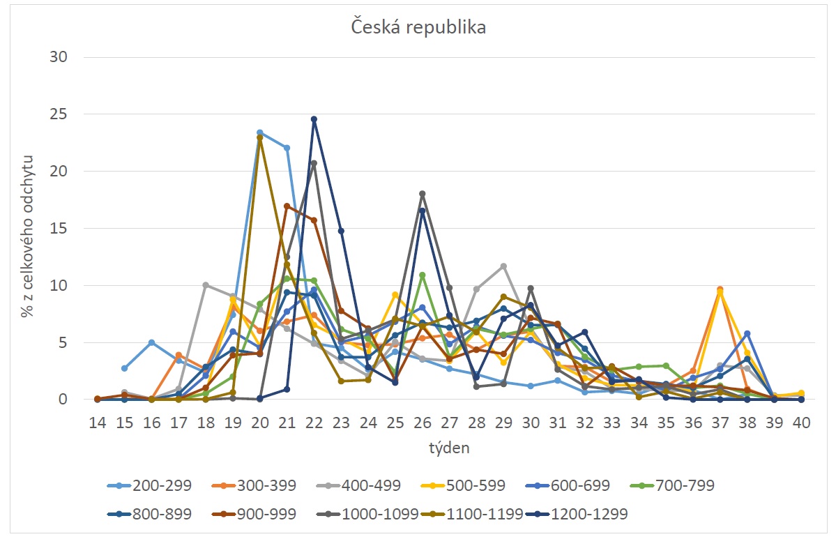 Středočeský kraj, kde bylo hodnoceno sedm výškových intervalů, opět do jisté míry odpovídá celorepublikovému hodnocení, se zaznamenaným třetím rojením v 37. a 38. týdnu. Průměrné odchyty zde byly relativně nízké, nejčastěji do výše 200 ks, avšak v intervalu 18. až 31. týdne dosahovaly až 1 000 zachycených jedinců.