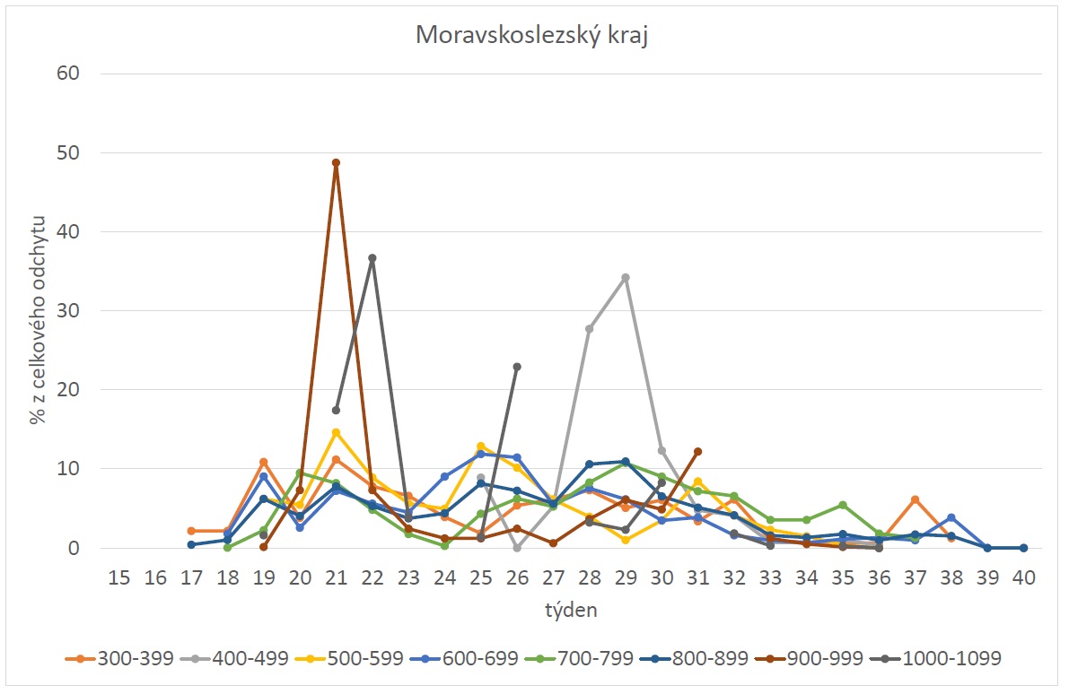 Moravskoslezský kraj, kde bylo sledováno osm výškových intervalů s velkým počtem odchytových míst, rovněž velmi koresponduje s celkovými odchyty v ČR. Vlastní odchyty byly v porovnání s dalšími kraji vysoké, obvykle se pohybovaly až do výše 2 000 zachycených jedinců, ale v mnoha případech se pohybovaly v intervalu 2 000 – 10 000 zachycených jedinců, a to až do 32. týdne. Poměrně vysoké odchyty byly zaznamenány i v 33.–38. týdnu.