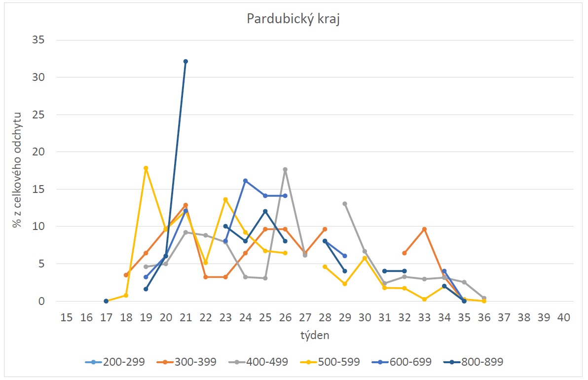 Pardubický kraj patří z hlediska vyhodnocování mezi atypické kraje. Sledováno zde bylo šest výškových intervalů. V některých výškových intervalech proběhlo první rojení od 18.–20. týdne, avšak v některých výškových intervalech se projevily zvýšené odchyty ve 22.–26. týdnu, což mohlo být opožděné první rojení, nebo sesterské přerojování. K druhému rojení ve výškovém intervalu 300–399 m n. m. došlo zřejmě v 33. týdnu. K ukončení sledování došlo v 36. týdnu, takže zde není podchycen potenciální začátek třetího rojení. Výše odchytů v tomto kraji byly velmi nízké, nejčastěji do stovky zachycených jedinců, částečně až do 300 ks, zcela výjimečně i výše, přičemž maximum bylo do 800 ks.