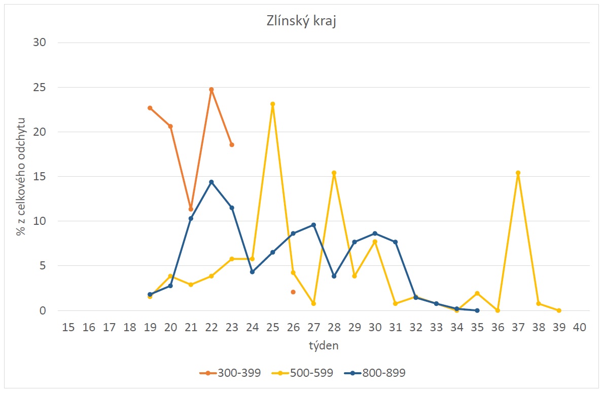Také Zlínský kraj patří mezi atypické kraje. Hodnoceny zde byly pouze tři nadmořské výšky. První rojení bylo ve výškovém intervalu 300–399 m n. m. zaznamenáno v 19. týdnu, avšak začalo zřejmě již dříve. Ve výškovém intervalu 800–899 m n. m. proběhlo v 21. týdnu a ve výškovém intervalu 500–599 m n. m. nebylo zaznamenáno, zjištěná kulminace letu ve 24. týdnu již spíše náleží sesterskému rojení; ve výškovém intervalu 800–899 m n. m. se sesterské rojení objevilo ve 27. týdnu. Druhé rojení proběhlo v rozmezí 29.–31. týdne. Třetí rojení (možná pouze druhé rojení) se ve výškovém intervalu 300–399 m n. m. objevilo v 37. týdnu. Průměrná výše odchytů zpravidla nepřekročila 500 jedinců, avšak až do 31. týdne se výjimečně pohybovala i v rozmezí 1 000 – 1 500 ks, s maximem 3 000 ks (v 37. týdnu ještě 2 000 ks).
