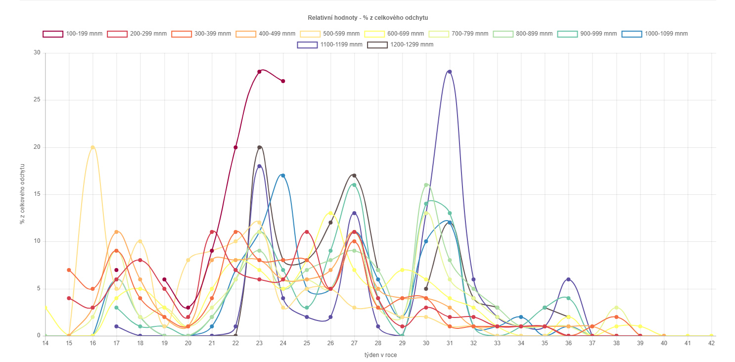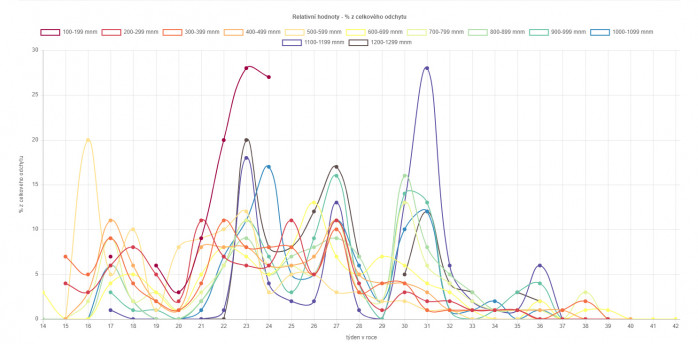 Maximální průměrný odchyt na odchytové místo byl dosažen v 16. týdnu v nadmořské výšce 500–599 m, a to cca 7 tis. jedinců, avšak i v ostatních týdnech v různých nadmořských výškách se pohyboval nejčastěji kolem 2 tis. jedinců a pod 1 tis. jedinců klesal pouze výjimečně, a to především v období ochlazení v první polovině května. Nižší průměrné odchyty byly zaznamenány také v nejvyšších nadmořských výškách. Od 21. týdne sice docházelo postupně k mírnému poklesu, ale ten není nijak dramatický, což je do jisté míry překvapivé. Ke zvýšení odchytů došlo na začátku druhého rojení ve 27. týdnu a následné ochlazení a deštivé počasí zapříčinilo mírný pokles. Ke zvýšení průměrných odchytů došlo v 30.–32. týdnu, a to překvapivě ve vyšších polohách. V následujících týdnech byly průměrné odchyty již slabší.