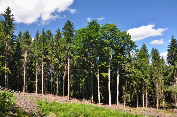 Vcelku zdravý smrkový porost s vtroušenými starými buky u Dobříše. Foto: Jan Řezáč