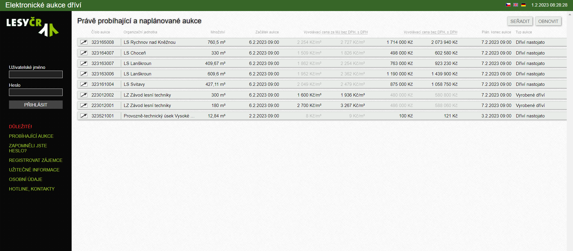 Seznamy aktuálně vypsaných aukcí jsou přístupné na webových stránkách LČR www.lesycr.cz v sekci Obchodní partneři pod odkazem Aukce hotových sortimentů, (https://lesycr.vars.cz), kde je možné si zobrazit PROBÍHAJÍCÍ AUKCE. Všechny aukce pro aktuální, resp. pro následující týden se zveřejňují vždy ve středu v 16.00 hodin.