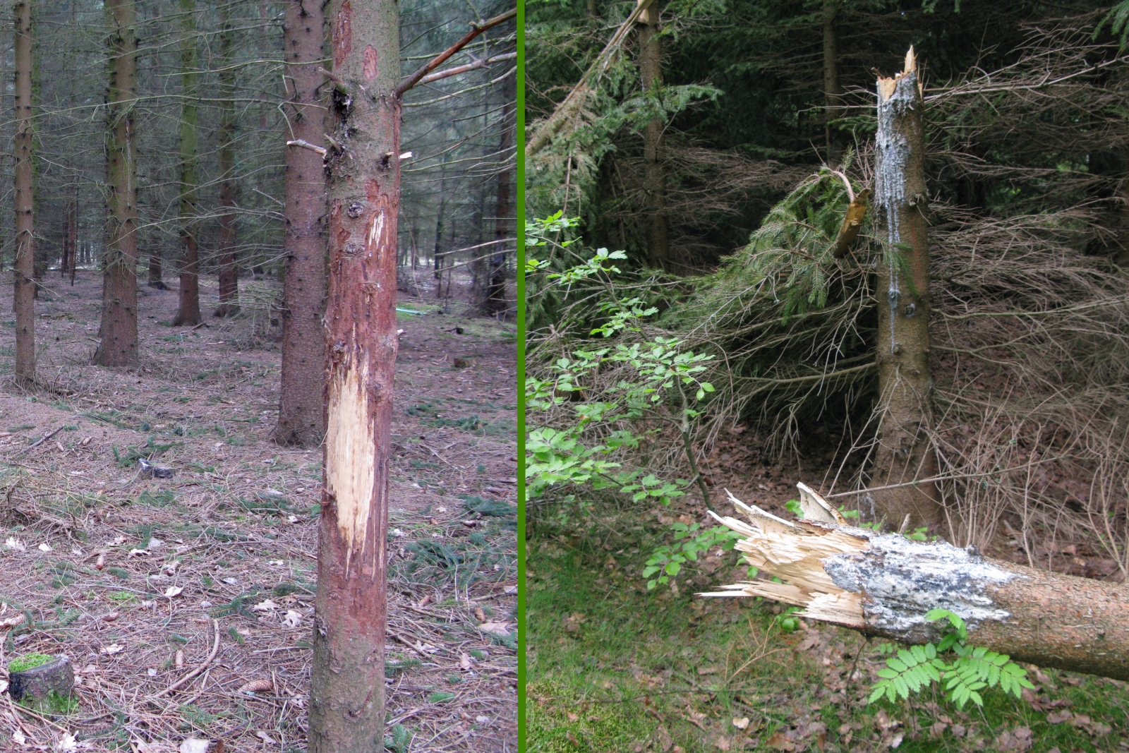 Ohryz kůry smrku spárkatou zvěří a vznik zlomů v místech poškození kmenů ohryzem zvěře. Foto: Jan Liška
