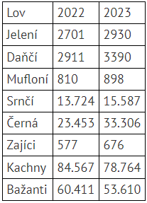 Meziročně narostl lov srstnaté zvěře o 28,5 procenta. Největší nárůst zaznamenali myslivci u divokých prasat o 42 procent, kdy zastřelili 33.306 kusů. U srnčího odstřelili 15 587 kusů, to je nárůst o 13,6 procenta. Jižní Čechy se v porovnání s ostatními kraji podílely druhou největší měrou na celkovém množství odstřelené zvěře v Česku, činila 17,4 procenta. Nejvíce zvěře bylo uloveno ve Středočeském kraji, včetně hlavního města Prahy, 19 procent.