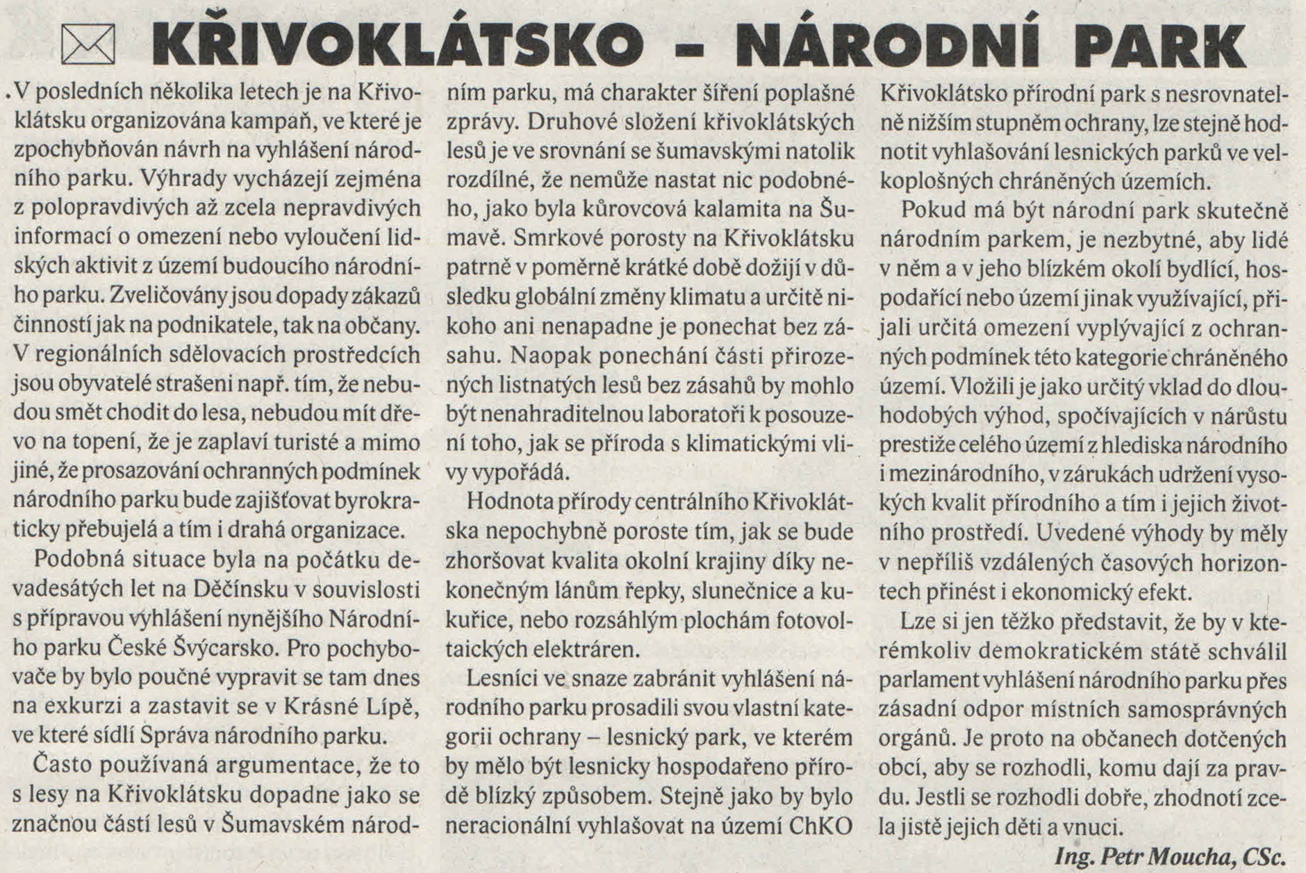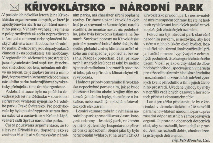 V Raportu 6.10.2015 vyšel článek Ing. Petra Mouchy, CSc., zabývající se možností vyhlášení NP Křivoklátsko. Kromě jiného se v něm dotkl také Lesnického parku Křivoklátsko, který zde byl svobodnou vůlí majitelů a správců lesů jako první v republice založen už v roce 2010 a oslavil tak letos 5. výročí svého trvání. To všechno za vlastní peníze a bez nároků na prostředky ze státního rozpočtu. Z článku Ing. Petra Mouchy vyplývá, že se plně neorientuje v poslání a fungování lesnických parků, a tak si dovolím ho trochu poopravit.