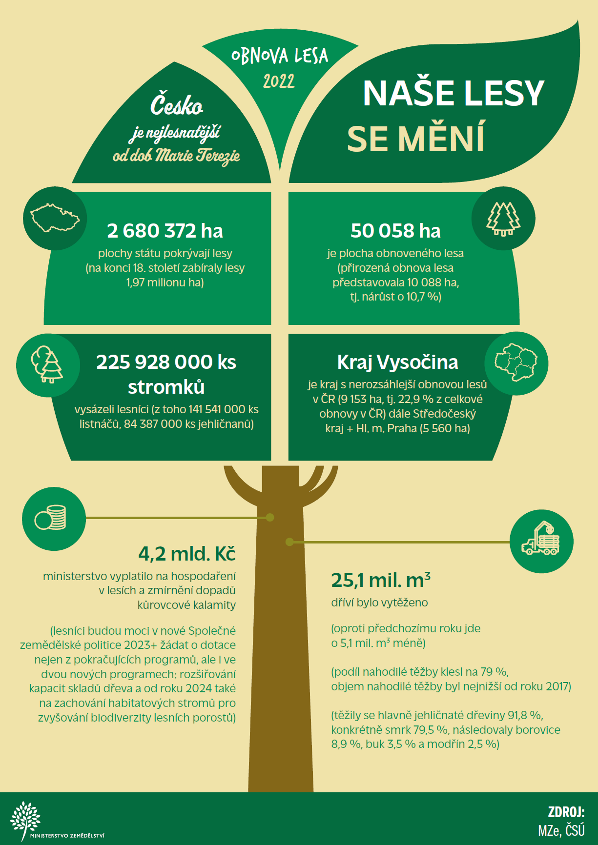 Listnatých stromů se v České republice vysazuje stále více. Třetí rok po sobě jich lesníci vysázeli více než jehličnanů, soustavně narůstá plocha přirozené obnovy lesa. Na ploše zničené kůrovcovou kalamitou a suchem tak vyrostou lesy druhově pestré a odolnější ke změně klimatu. Ministerstvo zemědělství poskytlo loni na obnovu lesů přibližně 4,2 miliard korun.