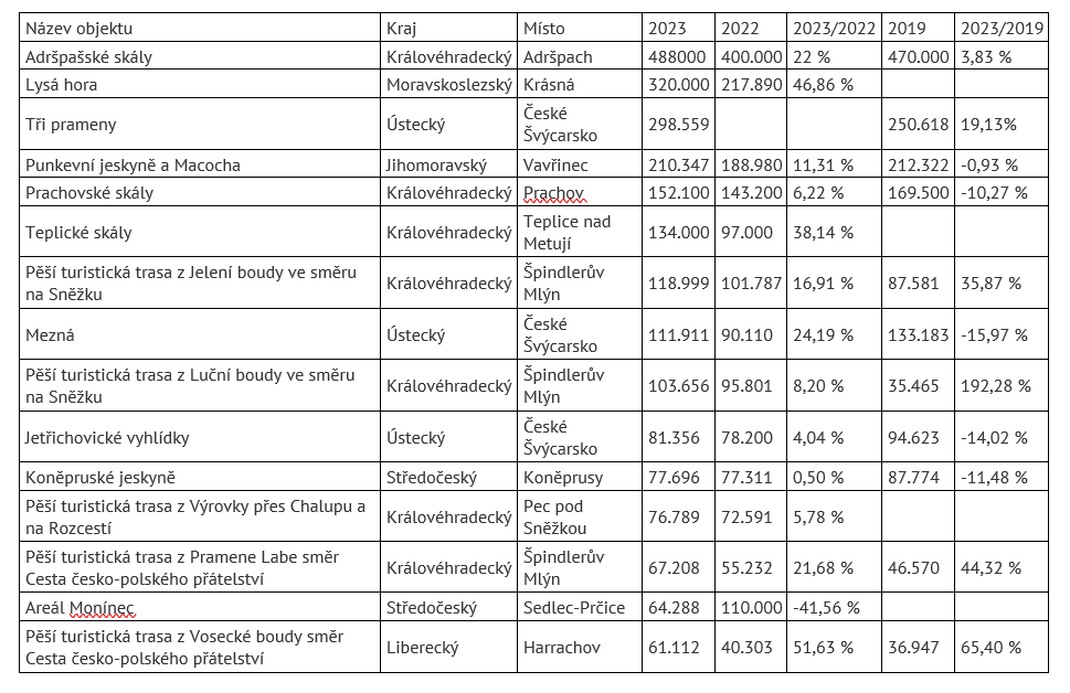 Za Adršpašskými skalami stejně jako předloni následovala Lysá hora v Moravskoslezském kraji, kterou navštívilo 320 000 lidí. Ve srovnání s rokem 2022 to byl téměř poloviční nárůst. Kolem čidla u rozcestí Tři prameny v Českém Švýcarsku, odkud vede trasa na Pravčickou bránu, loni prošlo přibližně 300 000 lidí, což bylo o necelou pětinu více než v roce 2019. K Pravčické bráně neměli turisté kvůli požáru, který v Českém Švýcarsku vypukl 23. července 2022, do 1. října 2022 přístup.
