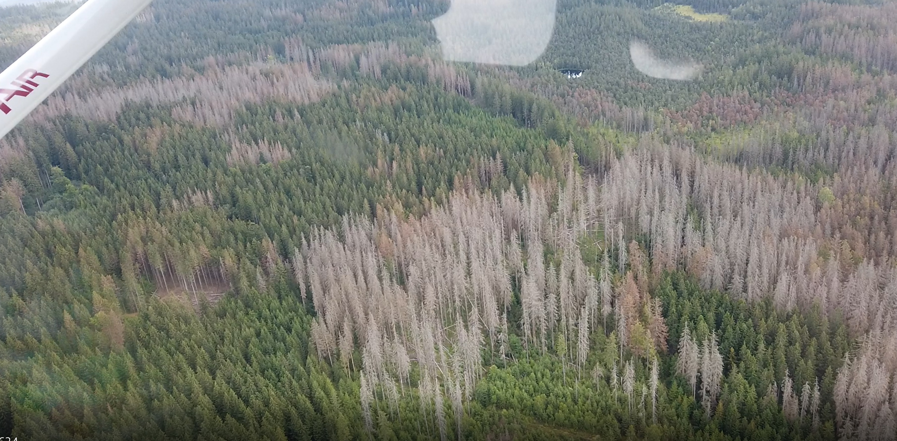 „Situace s kůrovcem se bohužel nevyvíjí dobře. Především na Rejvízu v Jeseníkách, kde již od zimy spadlo velmi málo srážek, nabývá kalamita opět na své síle. Za normálních okolností napadá kůrovec hlavně osluněné stěny lesního porostu, ve stinném lese se nevyvíjí tak dobře. Avšak nyní jsou lesy natolik rozvráceny probíhající kalamitou, že podkorní hmyz má mnohem větší příležitosti k šíření,“ vysvětluje Ing. Arnošt Buček a pokračuje: „Nejsou to jen smrkové monokultury, na které negativně dopadá aktuální deficit srážek. Přelet nad Chřiby u Velehradu nám odhalil plošné sesychání listnatých porostů, které se předčasným zbavováním listů brání odpařování vody. Sucho je tak extrémní, že většina listnatých porostů na Velehradě již nyní vypadá jako v půlce podzimu. Na nedostatek srážek trpí i mladé stromy, kterým se snižují přírůsty a některé dokonce usychají úplně,“ dodává Ing. Arnošt Buček.