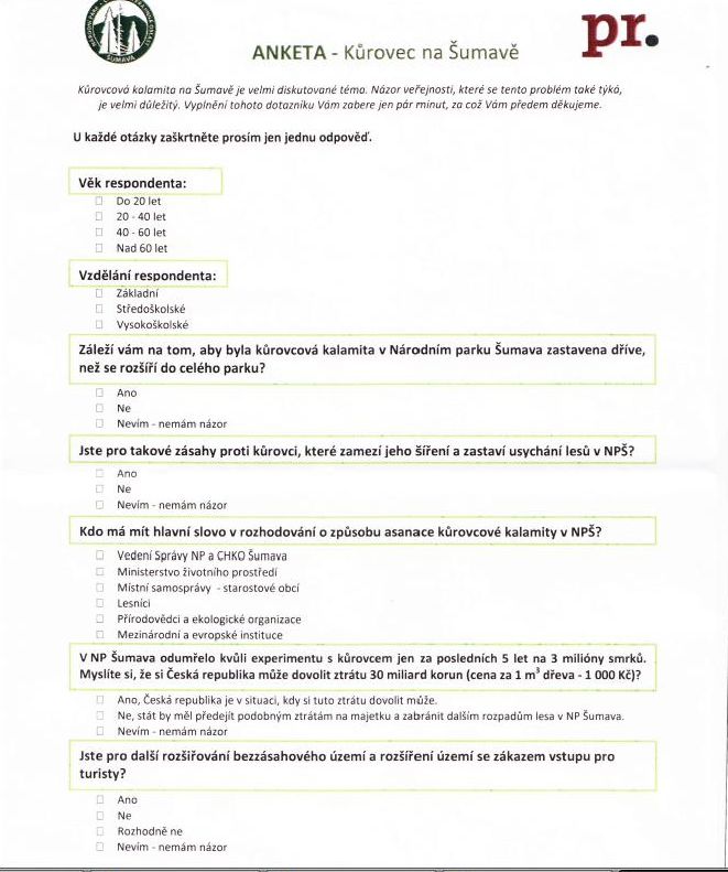 Člen stínové Rady Národního parku Šumava Ivan Rynda uvedl, že dotazník například zjišťuje, kdo by měl rozhodovat o způsobu sanace kůrovcové kalamity. Lidem se nabízí několik odpovědí, přičemž jedna z nich slučuje dohromady přírodovědce s ekologickými aktivisty.