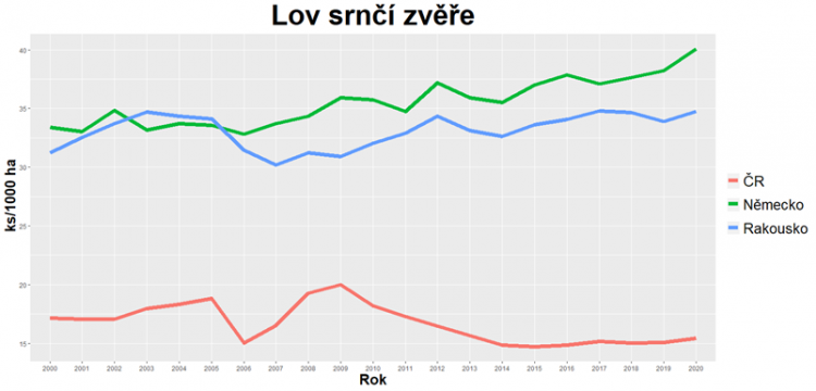 Srnec obecný je tedy prakticky jedinou spárkatou zvěří, kterou lze myslivecky obhospodařovat v honitbách menších výměr. Tomuto stavu odpovídají minimální výměry honiteb u našich západních sousedů. V sousedních zemích činí minimální výměra honiteb 150 ha (Německo), nebo dokonce pouze 115 ha (Rakousko). Zajistily ale tyto honitby snížení početnosti srnčí zvěře, jak je to prezentováno zastánci snížení minimální výměry i v našich podmínkách? Na tuto otázku lze odpovědět srovnáním výše lovu srnčí zvěře se zmíněnými okolními státy. Dostupná data za posledních 20 let byla pro objektivní porovnání přepočtena na počty ulovených jedinců srnčí zvěře na plochu 1000 ha. Z uvedeného srovnání je patrné, že zatímco v České republice je v posledních letech loveno přibližně 15 jedinců na danou jednotku plochy, rakouští myslivci loví mezi 30 až 35 jedinci a němečtí myslivci dokonce mezi 35 a 40 jedinci srnčí zvěř. V případě sousedních zemí je z grafu patrný stoupající trend lovu bez výraznějších propadů, které by značily významný zásah do populace a následně i sníženou reprodukční schopnost v dalších letech. Dlouhodobě stabilní, či dokonce rostoucí lov v honitbách menších výměr odpovídá násobě vyšší početnosti populace (kmenovým stavům) srnčí zvěře v těchto zemích.